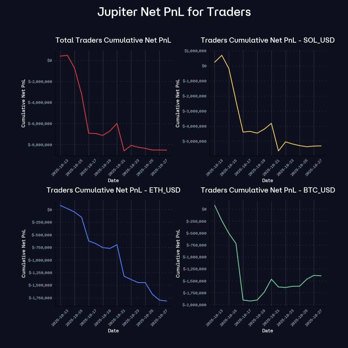 Due to Jupiter traders’ net long exposure, their aggregate realized PnL increased by $2.2M in gross terms and decreased by $1.8M after accounting for fees. Traders’ cumulative unrealized PnLs, meanwhile, increased by $9.1M this week.