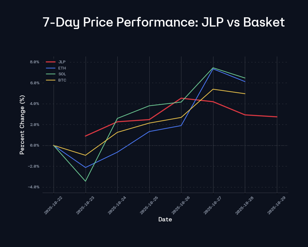 In the same span, SOL’s price increased by 6.46%, ETH’s price increased by 6.12%, and BTC’s price increased by 4.96%. JLP increased by 2.79% vs. the JLP basket’s 0.00% decrease, representing an outperformance of 2.74% for LPs relative to the JLP pool’s underlying assets.